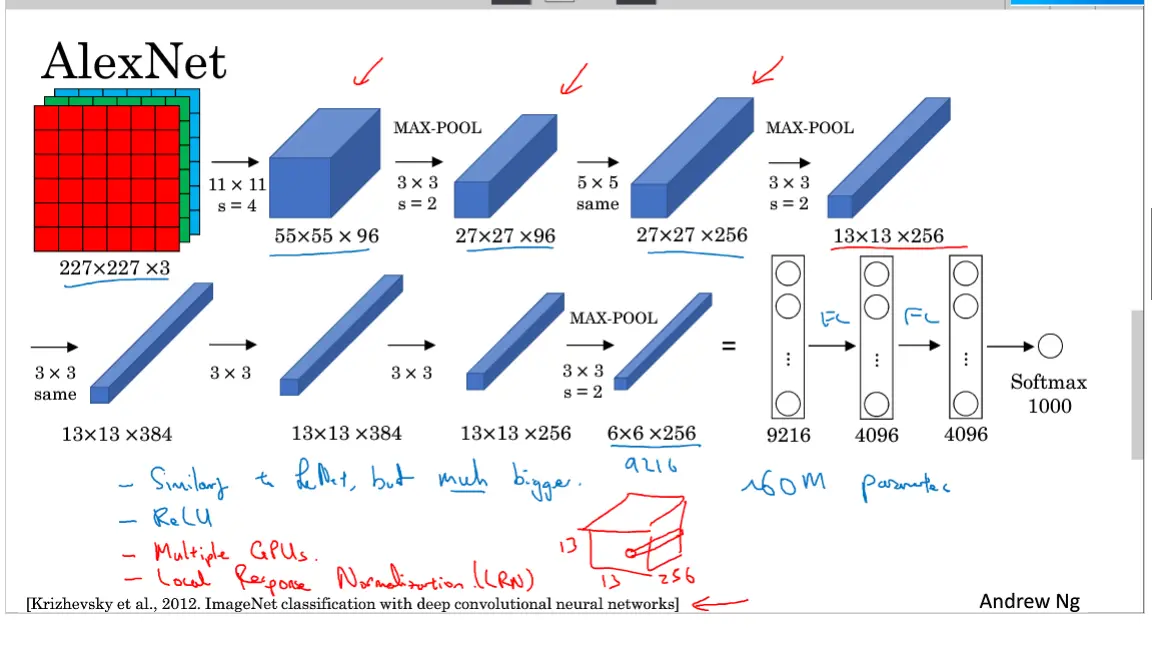 输入层:227 * 227 * 3 .卷积层11 * 11为96个,步长为4。池化层:参数为f=3,s=2。卷积层:卷积为same卷积,过滤器为3 * 3 有256个。池化层:f = 3,s = 2。卷积层:过滤器为3 * 3,384个,same卷积(操作3次,过滤器步数分别为384,384,256)。池化层:参数f=3,s=2。得到一个9216维向量。全连接层:FC1:4096个神经元。FC2:4096个神经元。