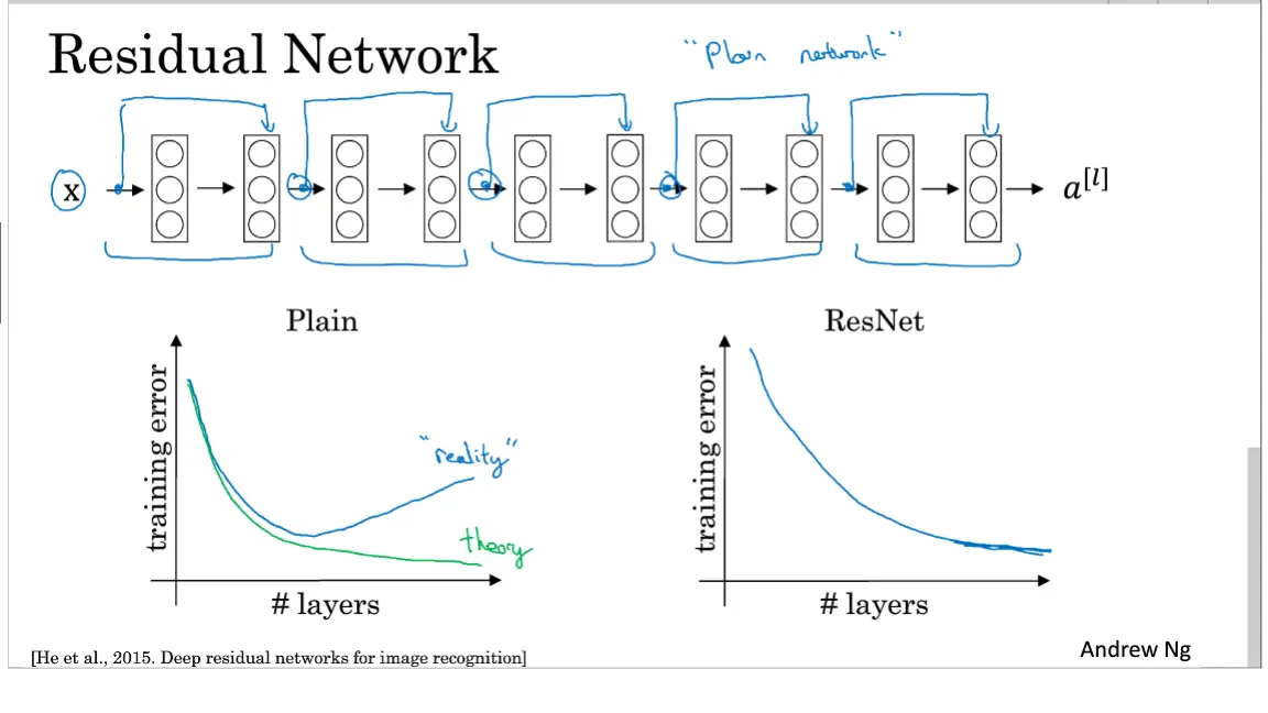 如果不运用残差网络,随着深度的加深,错误会先变大后变小。使用残差网络能有效解决这个问题。