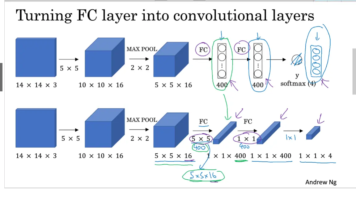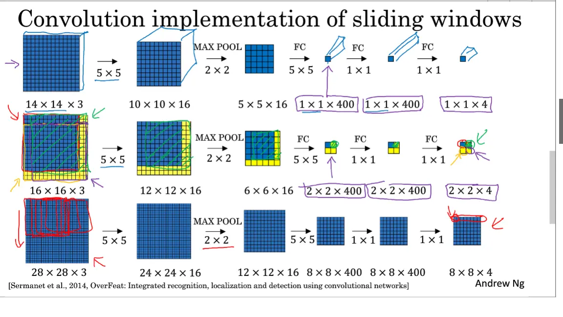 4.卷积的滑动窗口实现:将神经网络的全连接层转化成卷积层高,提高效率。这一步骤主要通过使用不同规模和数量的过滤器来实现。