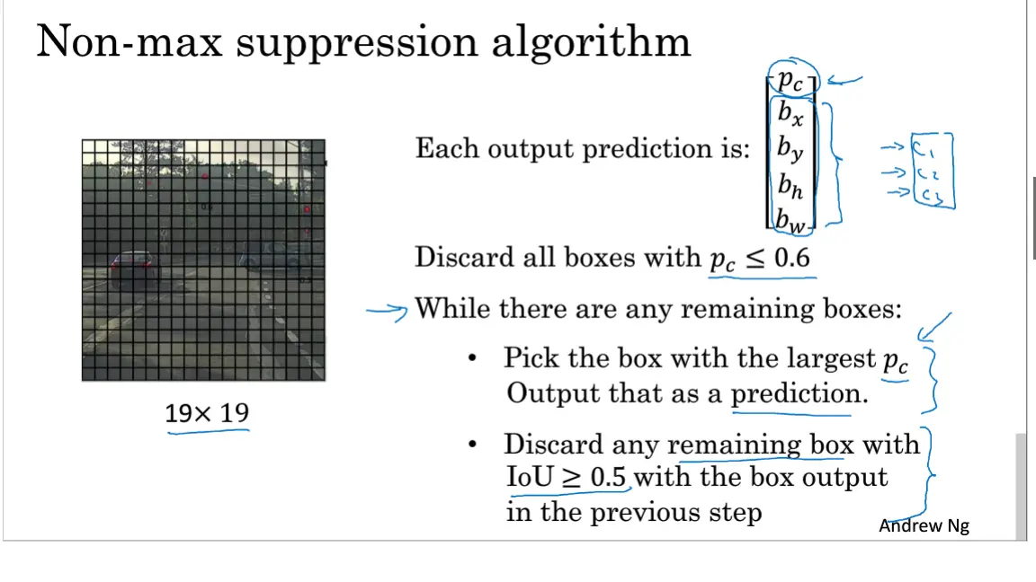 8.非极大值抑制,首先可以把Pc值小于某个设定值的小格去掉,接着找到Pc最大的小格,去掉与其IoU较大的小格,接着再从剩下的小格中找Pc最大的小格,去掉IoU较大的小格,重复...