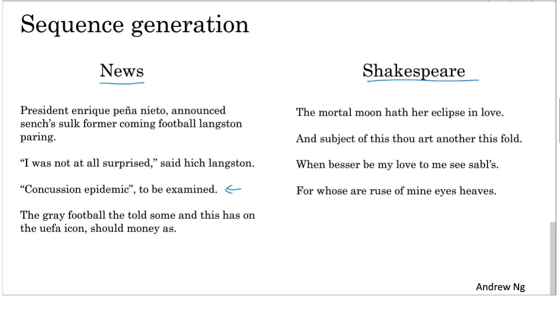 当训练完一个模型后我们如果想要了解该模型学到了什么我们可以对其进行采样。如:我们可以根据第一个预测结果y1_hat根据其向量概率分布得到第一个字,然后将其等于x _<2>输入。以此类推,然后就可以得到一段完整的句子。如用新闻文本训练和莎士比亚文章训练后得到的模型,采样后会得到图二的文本。