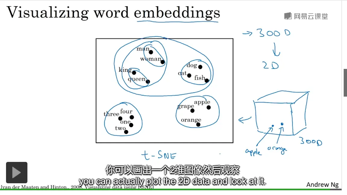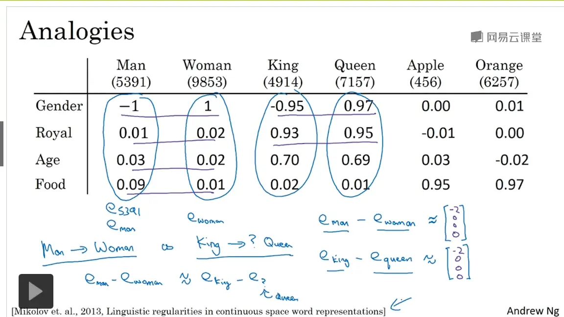1.词嵌入 如果一个词汇表表有一万个单词,one-hot编码后会得到1万维的较大向量,且每个向量的内积都相同,任两个词的距离都是一样的,如king,queen,apple用one-hot编码后他们的相关性也是一样的,体现不了词类这一概念。