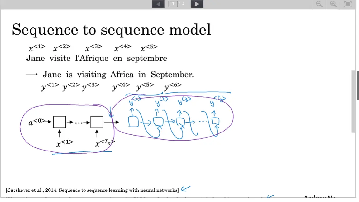 对机器翻译和语音识别起了关键作用 下图的基础模型把法语转化成英语的原理描绘了出来。左边为编码部分,将法语一个个输入,然后进行编码,右边为解码,解码成英语。