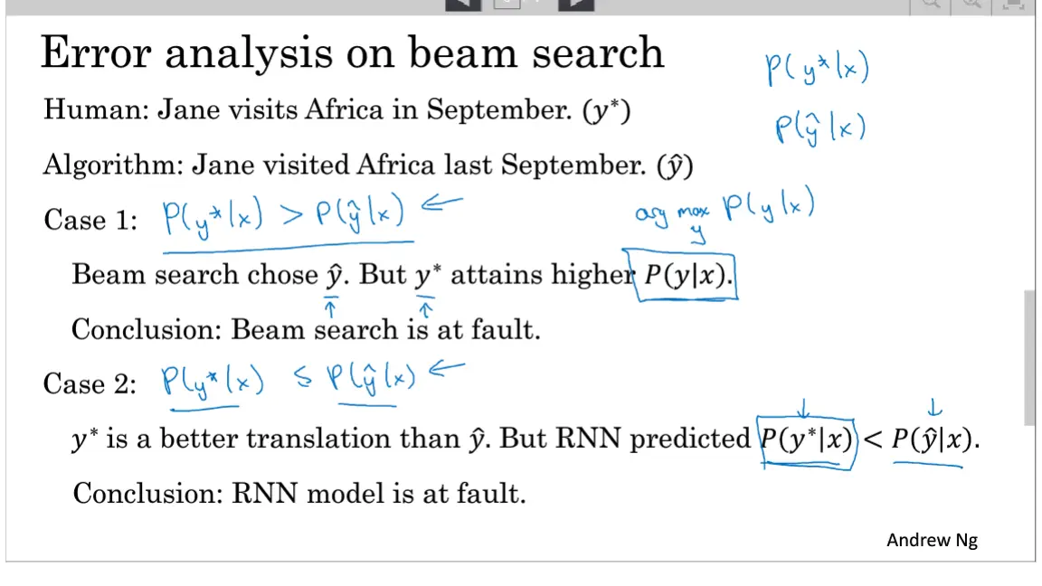 3.定向搜索误差分析 如果人类的翻译和机器翻译出来差别很大,我们可以计算出两个句子的概率,如果人类翻译的句子概率要比翻译出来的要大,但是该模型却输出了概率小的句子,那么说明搜索算法出现了出现,如果反过来那么就是RNN出问题了.通过多次的对比,统计两部分出问题的概率,然后针对问题较大的模块进行改善即可。