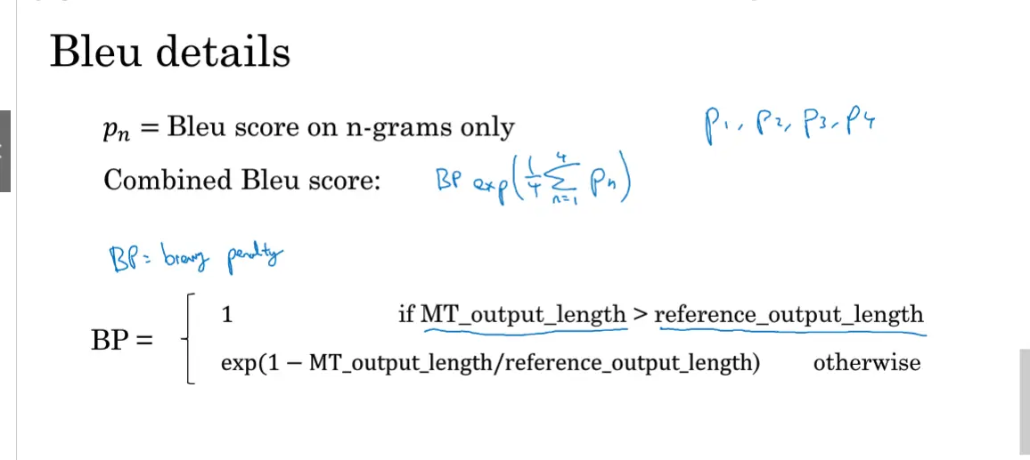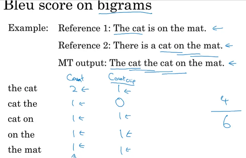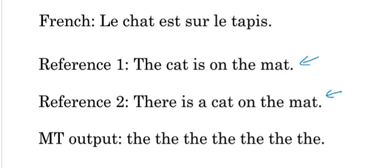 一元组评估细节 图中the标准翻译最多有两个,所以单词the的得分上限是2,又输出的句子有7个the,所以关于the的一元组评分是2/7。