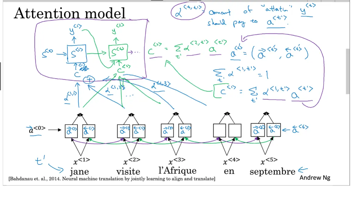 翻译较长句子时,我们的神经网络往往翻译会出现偏差,所以我们引入了注意力参数。通过双向RNN的正反两个激活值与注意力参数相乘组合成C。且所有注意力参数和为1。