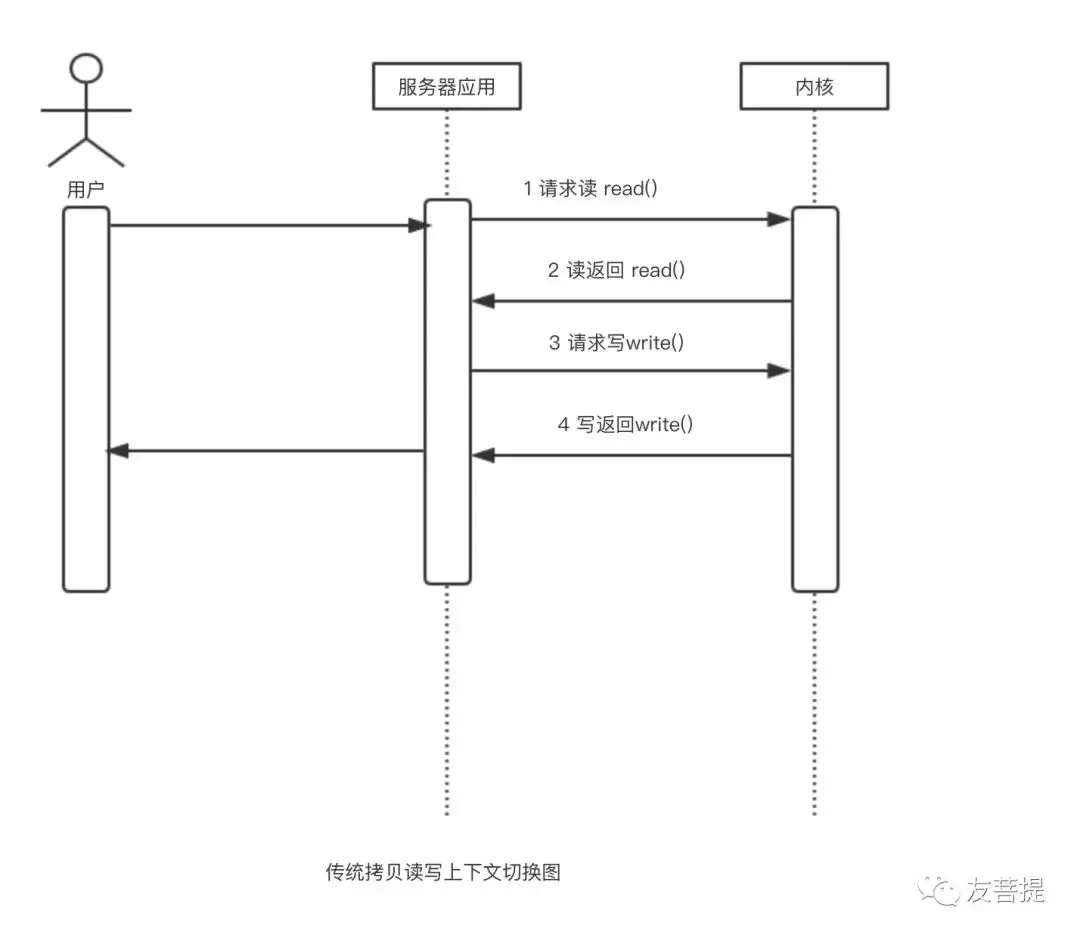 上面是一个 数据从服务器传输到网上的流程,如web应用程序静态内容展示,视频网站流量,电影网站数据下载等应用场景。 可以看出 传统的拷贝流程 涉及到 两次DMA直接拷贝 和两次 CPU拷贝。 CPU在处理系统进程和应用进程时会进行上下文切换 下图是一个上下文切换的时序图: