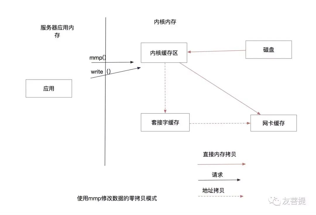 上面的零拷贝 是基于应用程序不会对 文件数据进行修改的情况下 ,如果要进行数据修改 数据还是要加载到 应用内存空间内, 如果应用程序能够直接操作 操作系统内核数据 则不需要拷贝到应用程序内,在Linux中使用mmp()方式完成应用程序数据直接写入内存。