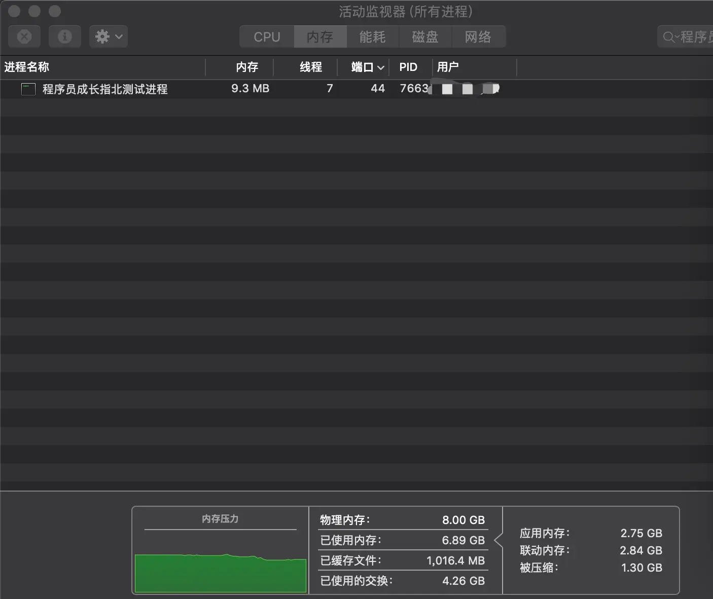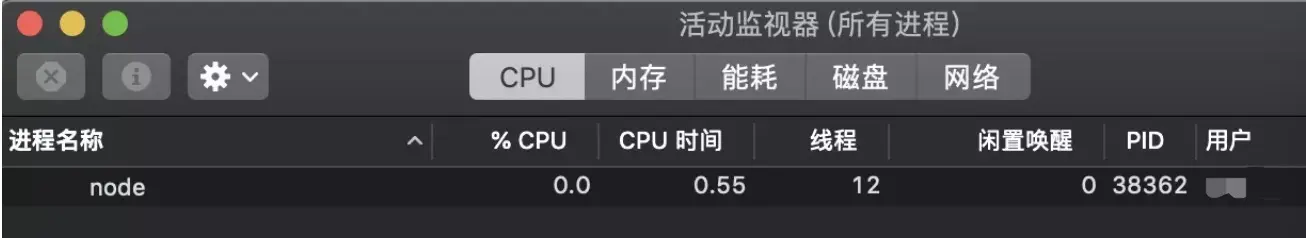 运行上面代码后,以下为 Mac 系统自带的监控工具 “活动监视器” 所展示的效果,可以看到我们刚开启的 Nodejs 进程 7663