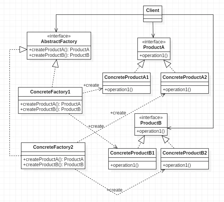 如上类图,ProductA和ProductB是一个产品族的两个抽象产品,两个抽象产品都各自有可能有多个实现,ConcreteProductA1、ConcreteProductA2、ConcreteProductB1、ConcreteProductB2都是这些抽象产品的具体实现。AbstractFactory是工厂类的抽象接口,包含所有产品创建的抽象方法,工厂类不止是去创建一个产品对象,而是负责创建一个产品族的对象