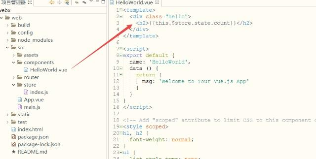 数据我们在页面是获取到了,但是如果我们需要修改count值怎么办?如果需要修改store中的值唯一的方法就是提交mutation来修改,我们现在Hello World.vue文件中添加两个按钮,一个加1,一个减1;这里我们点击按钮调用addFun(执行加的方法)和reductionFun(执行减法的方法),然后在里面直接提交mutations中的方法修改值: