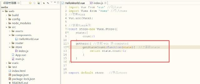 Getter相当于vue中的computed计算属性,getter 的返回值会根据它的依赖被缓存起来,且只有当它的依赖值发生了改变才会被重新计算,这里我们可以通过定义vuex的Getter来获取,Getters 可以用于监听、state中的值的变化,返回计算后的结果,这里我们修改Hello World.vue文件如下: