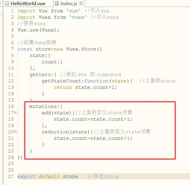 修改index.js文件,添加mutations,在mutations中定义两个函数,用来对count加1和减1,这里定义的两个方法就是上面commit提交的两个方法如下: