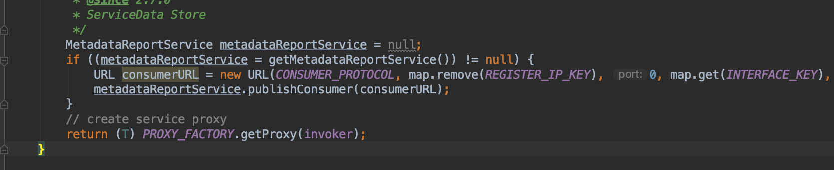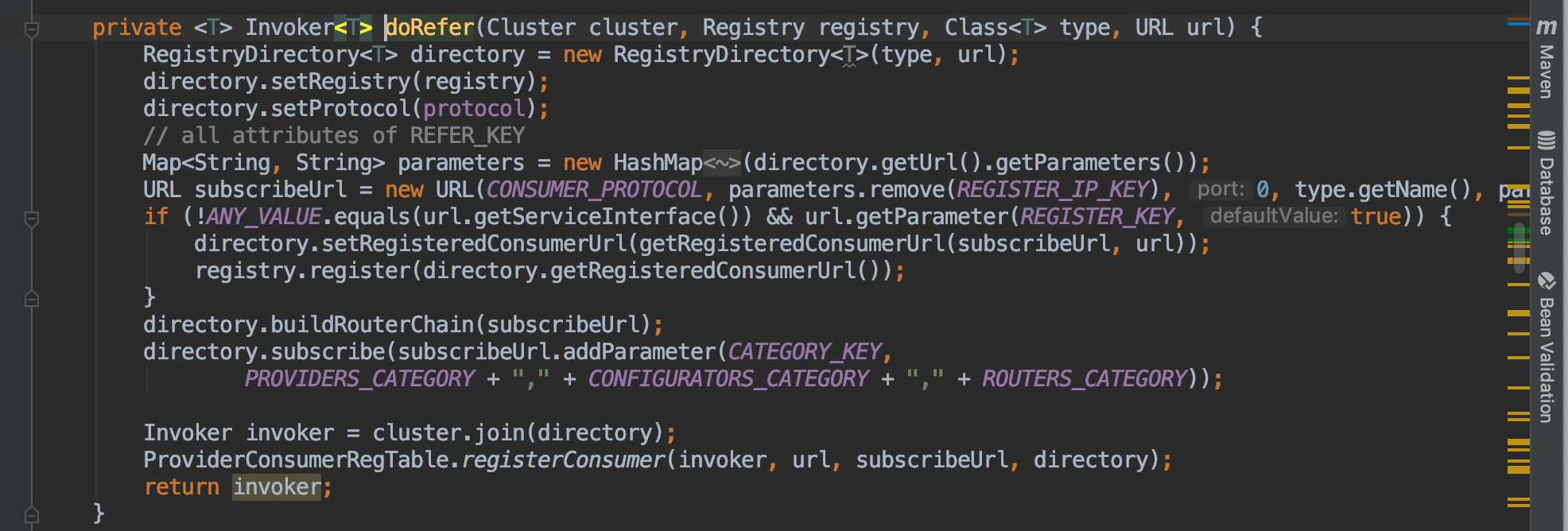 RegistryProtocol的refer方法,这里首先会删除了URL参数中registry的key,并设置协议为Dubbo,接着判断是否注册的信息是否是RegistryService类型的bean,如果是通过ProxyFactoy包装成Invoker返回,然后判断@Reference是否配置group.然后调用doRefer进行服务引用.
