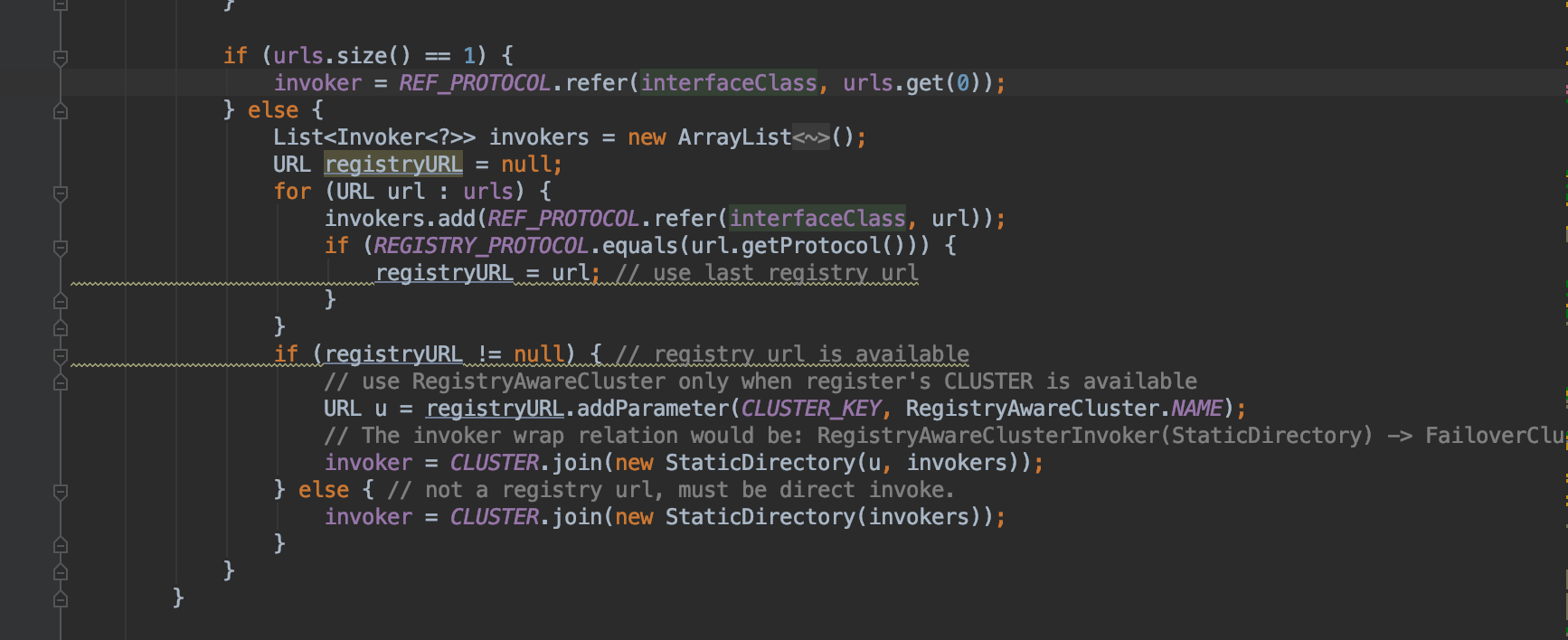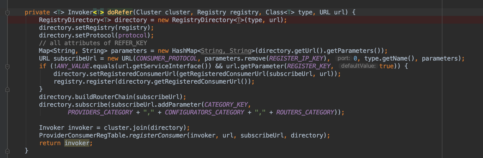 这里doRefer方法是通过RegistryDirectory向注册中心注册元数据信息,并且订阅注册中心提供者信息,然后通过Cluster.join合并成一个Invoker,默认集群策略是FailOver的,所以这里返回的Invoker对象是FailoverClusterInvoker