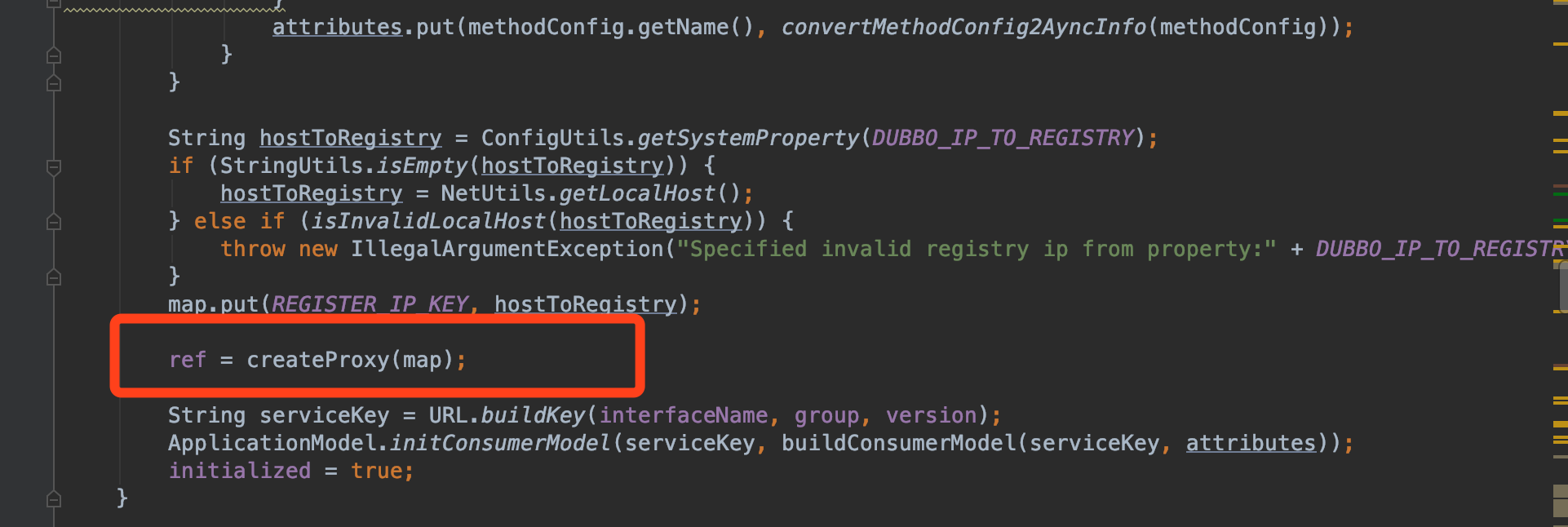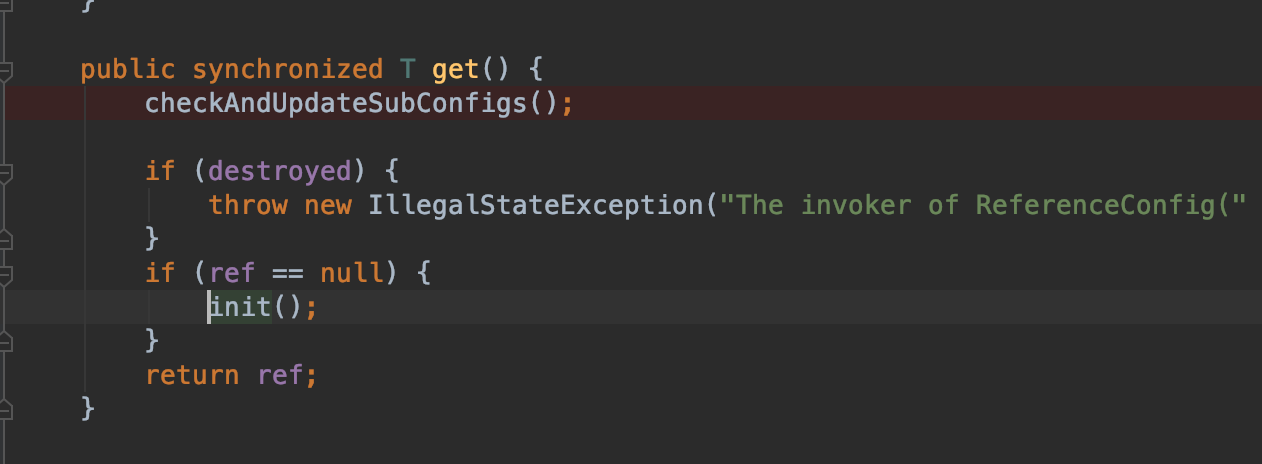 通过ReferenceBean中get方法中获取通过init方法初始化生成代理对象.
