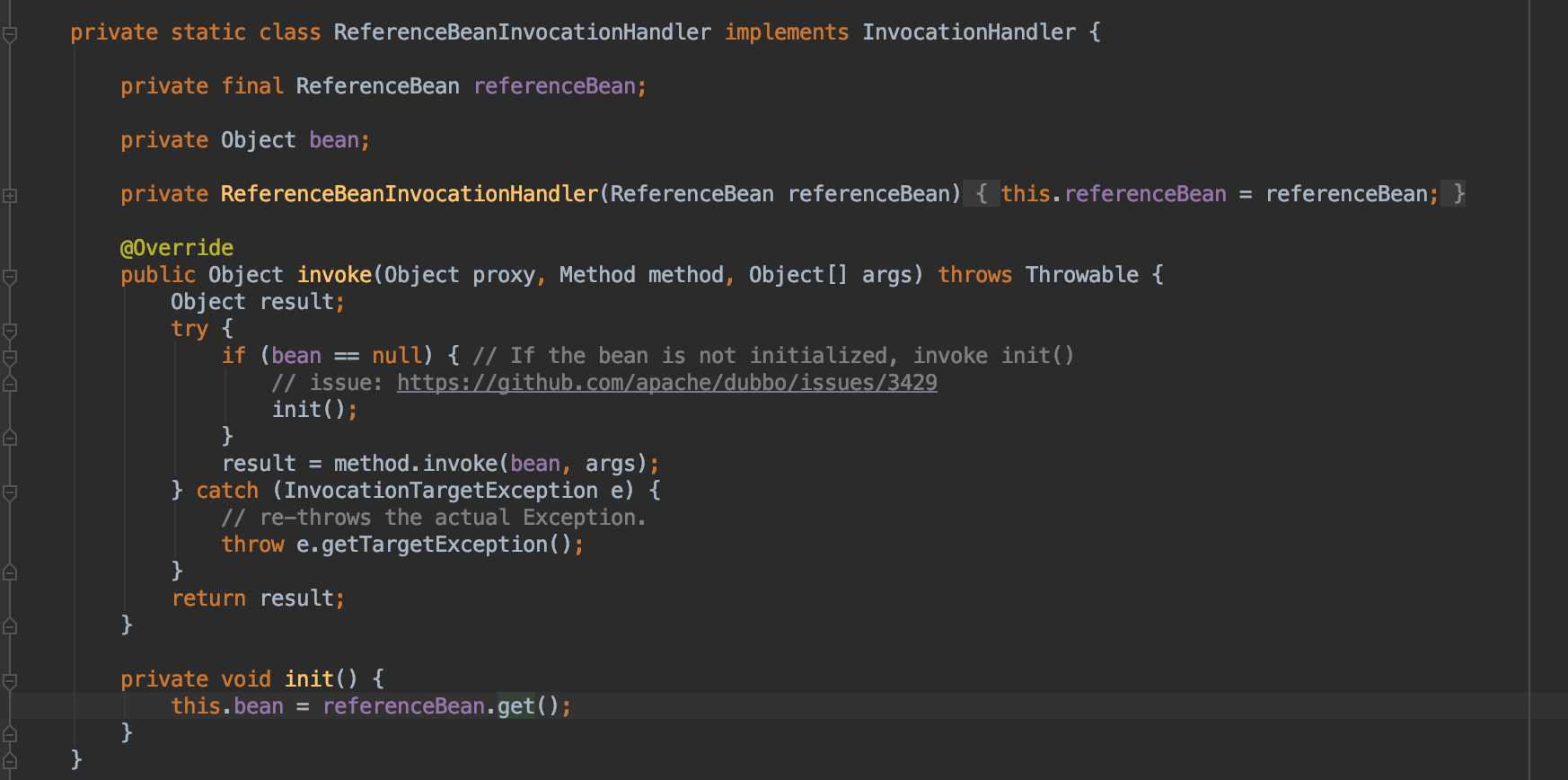 ReferenceBeanInvocationHandler中bean就是通过init方法中的createProxy方法中生成代理代理对象.