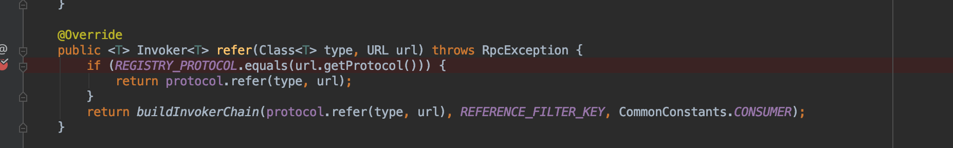 然后调用ProtocolFilterWrapper中refer方法,这里判断URL的Protocol中的协议是否是Registry的协议,由于我们配置了zookeeper的注册中心,这里第一个if判断是true,并且这里注入的对象是RegistryProtocol中,并执行RegistryProtocol.refer方法返回Invoker对象.