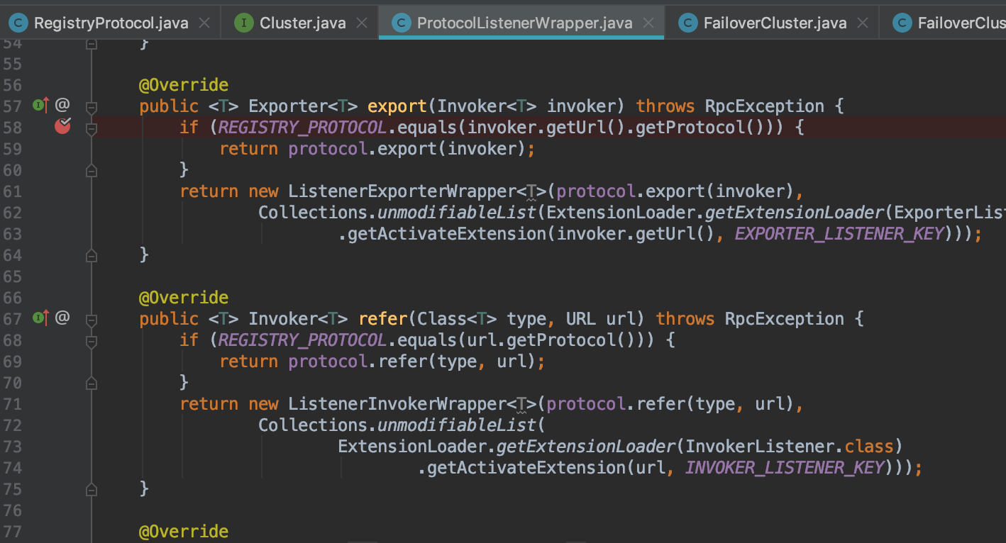 首先会调用ProtocolListenerWrapper的refer方法,这里判断URL的Protocol中的协议是否是Registry的协议,则调用protoco(这里注入的protocol是ProtocolFilterWrapper)的refer方法