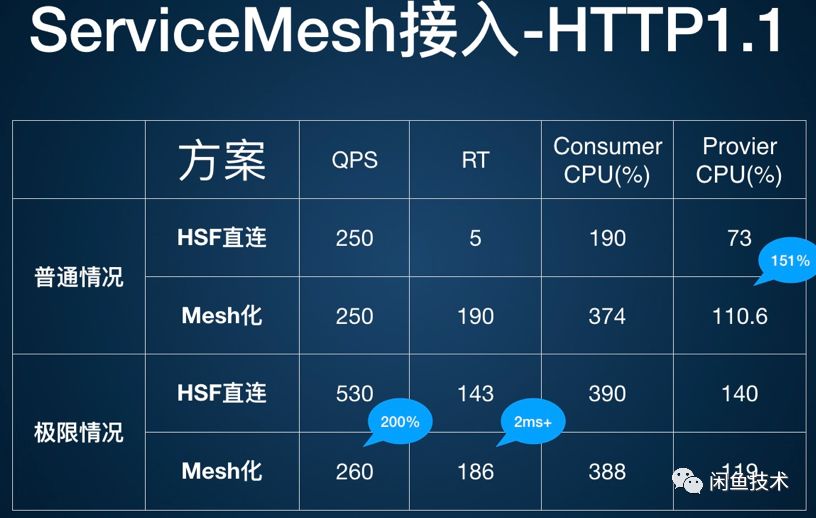 如图所示,HSF方案下,HSF RPC协议实现为Mesh SideCar的一个扩展协议。在数据面:业务进程与SideCar,SideCar与Service Provider 之间采用HSF 2.0私有协议,数据编码采用Hessian 1.0。 业务进程集成了Mesh化改造的HSFCPP SO库作为MeshClient,负责与Mesh SideCar通信。而在控制面:SideCar与Configsvr直连,同步服务提供者列表和配置信息,采用差量同步方式,以降低控制面板的CPU消耗。 详细测试数据如下: