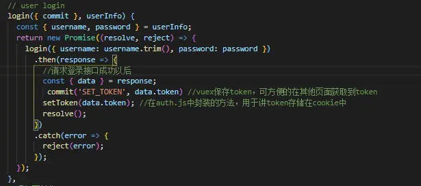 // user login login({ commit }, userInfo) { const { username, password } = userInfo return new Promise((resolve, reject) => { login({ username: username.trim(), password: password }).then(response => {//请求登录接口成功以后 const { data } = response commit('SET_TOKEN', data.token) //vuex保存token,可方便的在其他页面获取到token setToken(data.token) //在auth.js中封装的方法,用于讲token存储在cookie中 resolve() }).catch(error => { reject(error) }) }) }以上代码截图为: