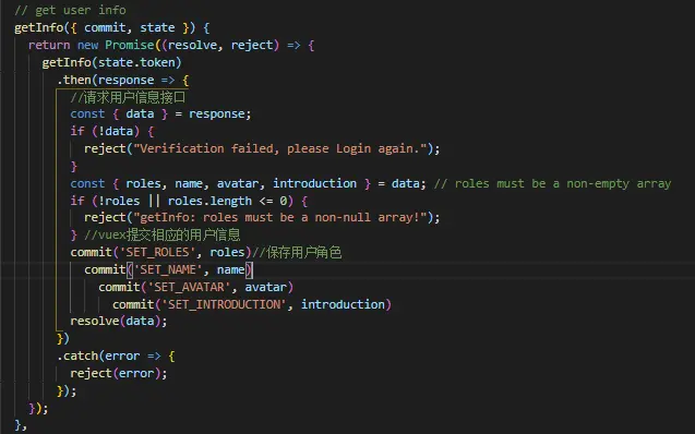 // get user info getInfo({ commit, state }) { return new Promise((resolve, reject) => { getInfo(state.token).then(response => {//请求用户信息接口 const { data } = response if (!data) { reject('Verification failed, please Login again.') } const { roles, name, avatar, introduction } = data // roles must be a non-empty array if (!roles || roles.length <= 0) { reject('getInfo: roles must be a non-null array!') } //vuex提交相应的用户信息 commit('SET_ROLES', roles)//保存用户角色 commit('SET_NAME', name) commit('SET_AVATAR', avatar) commit('SET_INTRODUCTION', introduction) resolve(data) }).catch(error => { reject(error) }) }) }以上代码截图为: