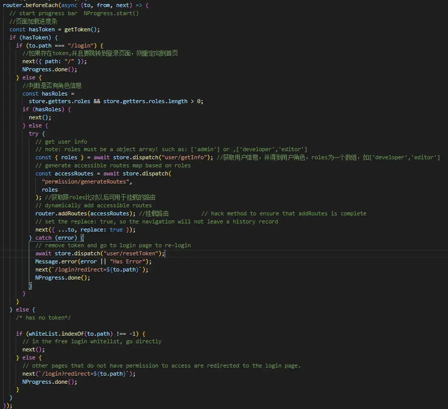 // remove token and go to login page to re-login await store.dispatch('user/resetToken') Message.error(error || 'Has Error') next(`/login?redirect=${to.path}`) NProgress.done() } } } } else { /* has no token*/ if (whiteList.indexOf(to.path) !== -1) { // in the free login whitelist, go directly next() } else { // other pages that do not have permission to access are redirected to the login page. next(`/login?redirect=${to.path}`) NProgress.done() } }})以上代码截图为: