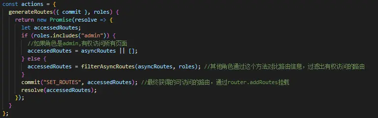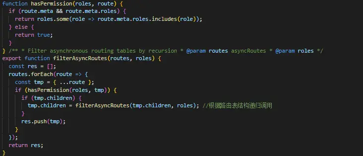 const actions = { generateRoutes({ commit }, roles) { return new Promise(resolve => { let accessedRoutes if (roles.includes('admin')) {//如果角色是admin,有权访问所有页面 accessedRoutes = asyncRoutes || [] } else { accessedRoutes = filterAsyncRoutes(asyncRoutes, roles)//其他角色通过这个方法对比路由信息,过滤出有权访问的路由 } commit('SET_ROUTES', accessedRoutes)//最终获得的可访问的路由,通过router.addRoutes挂载 resolve(accessedRoutes) }) }}function hasPermission(roles, route) { if (route.meta && route.meta.roles) { return roles.some(role => route.meta.roles.includes(role)) } else { return true }}/** * Filter asynchronous routing tables by recursion * @param routes asyncRoutes * @param roles */export function filterAsyncRoutes(routes, roles) { const res = [] routes.forEach(route => { const tmp = { ...route } if (hasPermission(roles, tmp)) { if (tmp.children) { tmp.children = filterAsyncRoutes(tmp.children, roles) //根据路由表结构递归调用 } res.push(tmp) } }) return res}以上代码截图为: