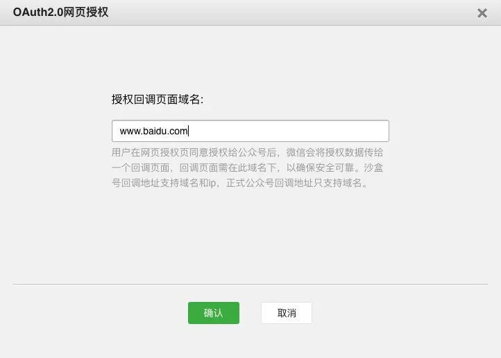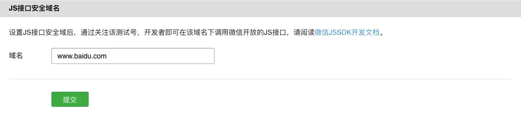 如果是做微信网页授权登录,需要配置两个域名回调。第一个是 JS接口安全域名 第二个是 授权回调页面域名。这两个域名都必须是公网上可以访问的域名地址,并且不可以加端口号。比如我的域名是 wwww.baidu.com ,那么需要在这两个地方填入 www.baidu.com 。协议头 http:// https:// 不要填进去。