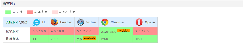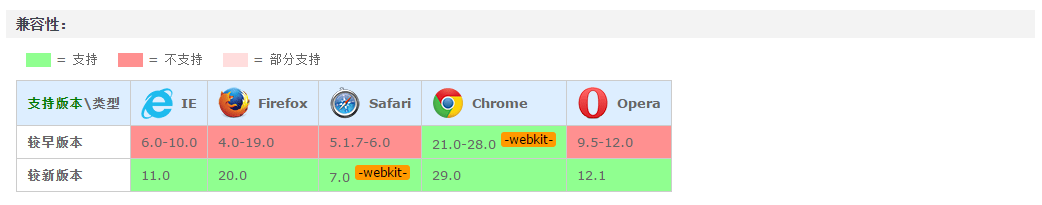 但是想在移动端用好这个布局摸透这个属性 我还是一个个都探究下吧,在此先说下各浏览器PC端最新版本情况目前:IE最新版本是ie11, FF最新版本是ff41.0, Chrome最新版本是chrome45.0, Safira最新版本8.0.3, opera最新版本是31 然而这些最新版本对我们来说并没什么卵用 只是个标准 没有谁电脑装的都是最新版浏览器,好吧 看下各个属性兼容