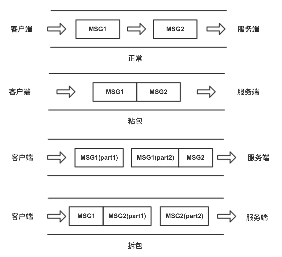 如图所示,客户端和服务端之间的通道代表TCP的传输通道,两个箭头之间的方块代表一个TCP数据包,正常情况下一个TCP包传输一个应用数据。粘包时,两个或多个应用数据包被粘合在一起通过一个TCP传输。而拆包情况下,会一个应用数据包会被拆成两段分开传输,其他的一段可能会和其他应用数据包粘合。