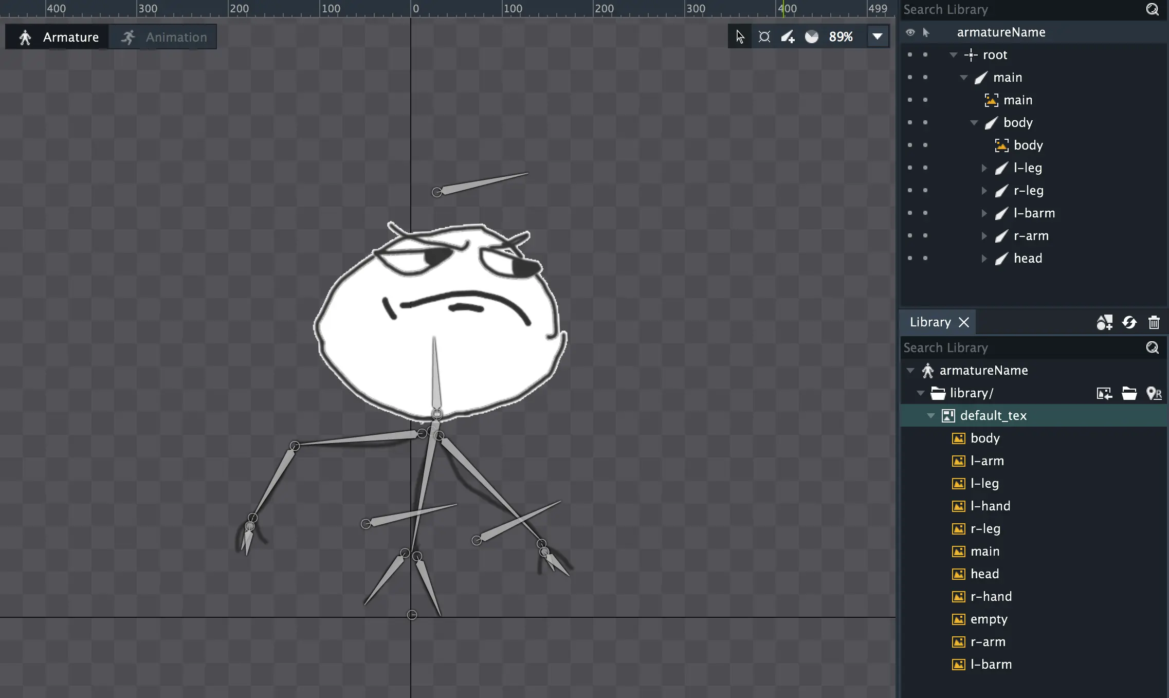 随后通过 DragonBones 提供的 PS 插件将他们导入到 DragonBones,按照不同部分摆放、绑定骨骼,并创建工程: