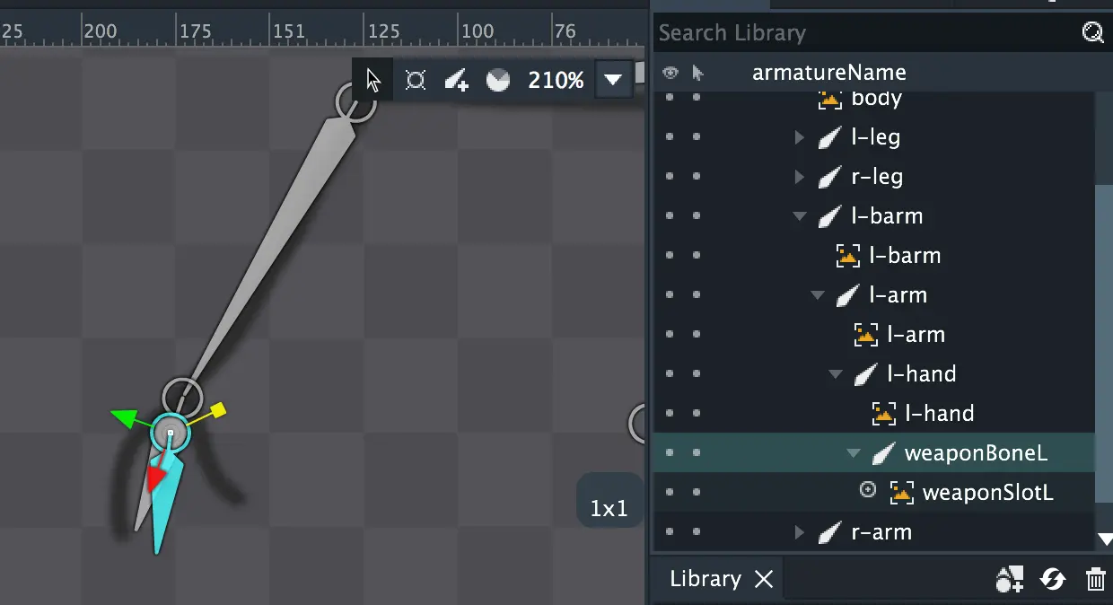 这里给手骨 l-hand 添加了一个子骨骼 weaponBoneL 以及插槽 weaponSlotL 来实现动态装载子骨骼,需要注意的是,这里的 weaponSlotL 图片不能为空,否则在运行时动态替换 Slot 时会抛出错误,笔者的做法是使用一张1x1的透明图片占位。