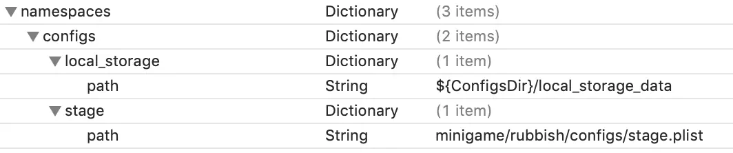 通过加载资源描述符构建出资源路径表,通过 namespace + key 的方式查询实际路径,路径查找通过 R 函数实现,例如查找 local_storage 文件的路径,则使用 R("configs", "stage"),这里模仿了 Android 对本地资源的管理方式。