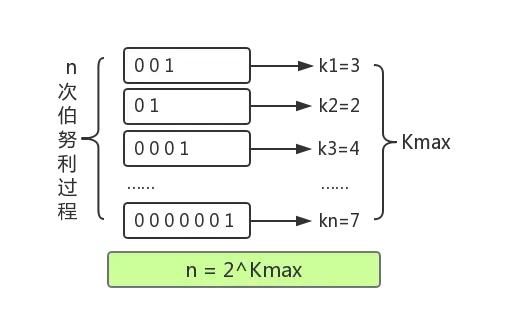 由于比特串每个比特都独立且服从0-1分布,因此从左到右扫描上述某个比特串寻找第一个“1”的过程从统计学角度看是一个伯努利过程,例如,可以等价看作不断投掷一个硬币(每次投掷正反面概率皆为0.5),直到得到一个正面的过程。在一次这样的过程中,投掷一次就得到正面的概率为1/2,投掷两次得到正面的概率是