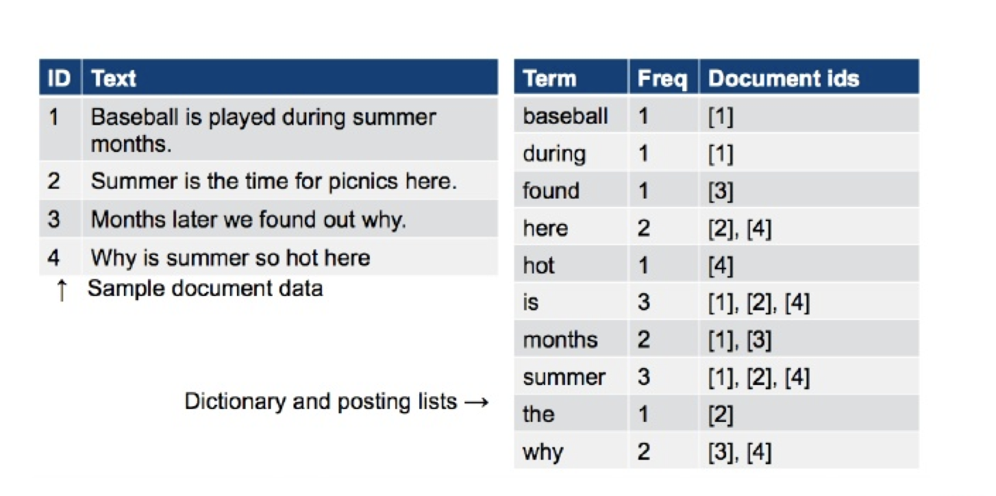(term)。对词条进行编号,以词条为索引,保存相关信息(词频,文档编号,位置信息)。图一右侧posting list