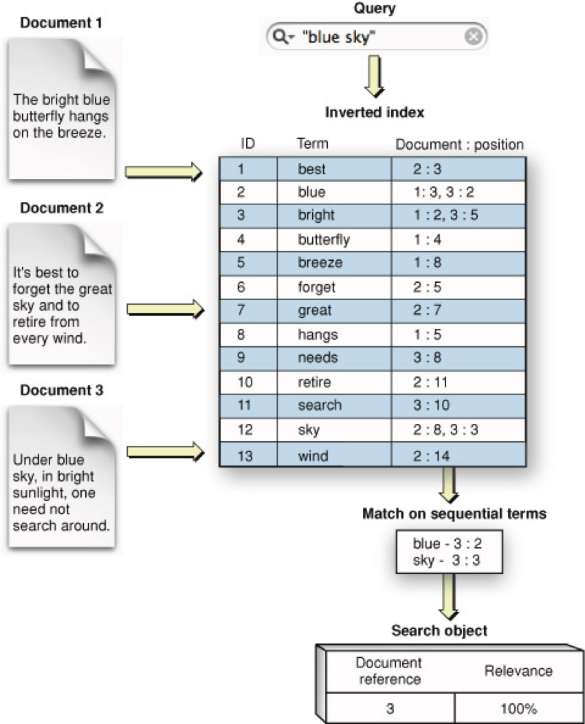 经过对比,两个关键词同时出现在Document3,分别位于位置2、3。于是返回Document3作为检索到的文档