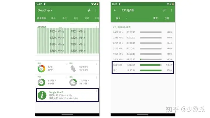 在 DevCheck 信息面板,我们可以看到手机当前大概的运行状态,其中就包括了「运行时间」和「深度休眠」这两种时间信息,点击「CPU 频率」的柱状图也可以查看 CPU 频率分布和深度休眠的时间统计。在理想状态下,除去亮屏和充电状态以外的运行时间内,深度休眠的占比应该是越高越好。