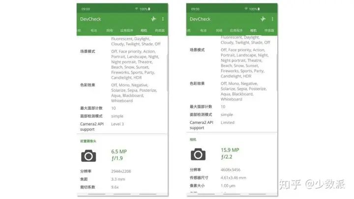 DevCheck 还能够检测到你的设备对 Camera2 API 的支持等级,也就是说,每一个 Camera2 API 等级都对相机功能有不同程度的支持。如果是配备了多摄的手机,那每一颗摄像头对 Camera2 API 的支持程度可能都不同。在 S10 中,主摄像头的 Camera2 API 支持等级是 Level 3,最直观的感受就是 允许拍摄 RAW 格式照片 ,而只支持到 Limited 等级的前置摄像头和广角镜头并不支持此项功能,只支持一些基本相机功能和受到限制的高级功能。