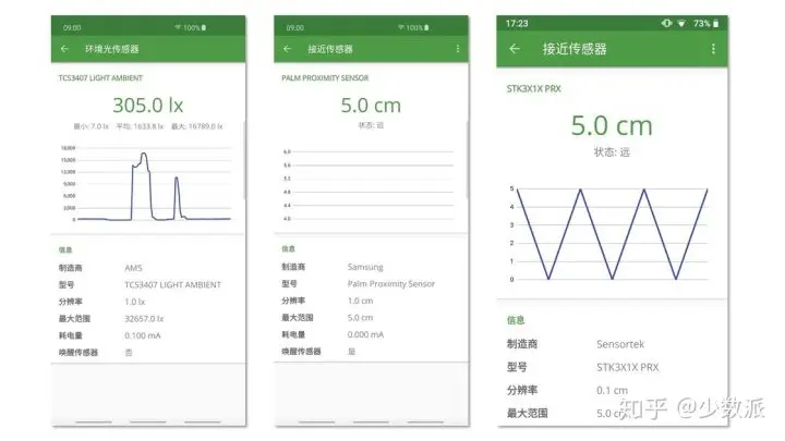 以光线传感器为例,该传感器详情页同样呈现一个坐标轴和照度数值显示(单位是 lx)。尝试使用手遮挡听筒旁边的光线传感器,或者用手电筒直接照射,坐标轴和照度数值应呈现剧烈变化(左图)。