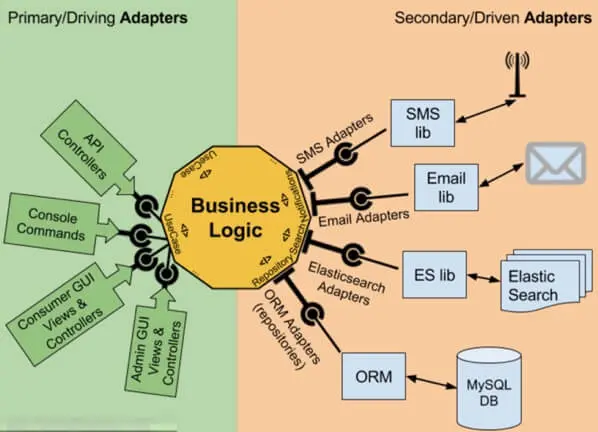 若将其可视化,Driving Adapter和Driven Adapter基于端口围绕着应用形成左右结构,有别于传统的分层形象,形成一个六边形,因此也会称作六边形架构