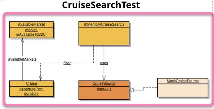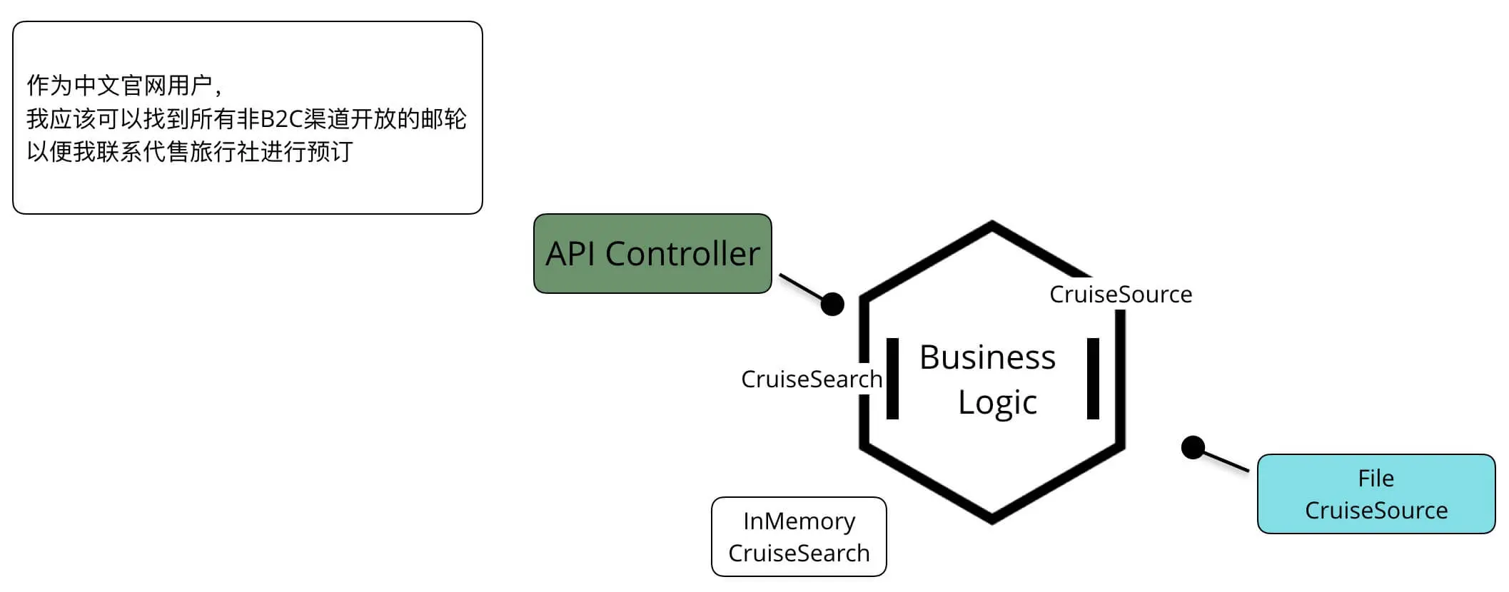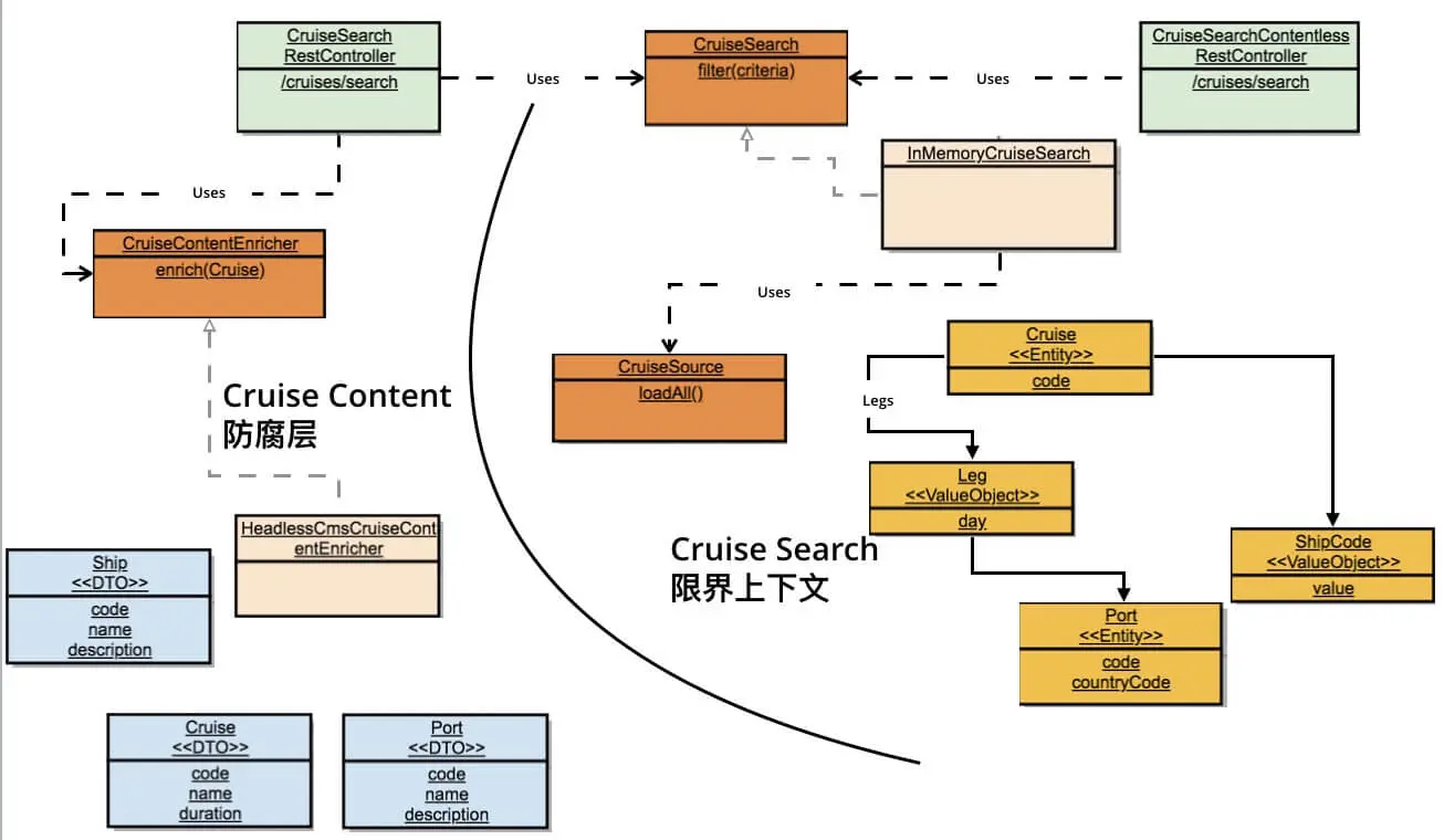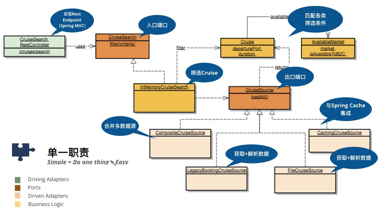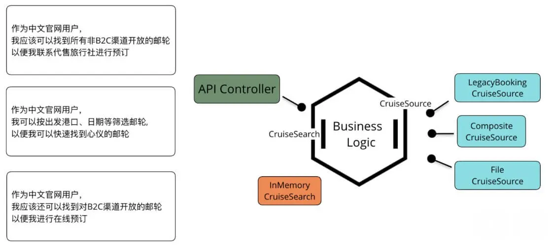 - CruiseSearch作为应用的入口,向Driving Adapter屏蔽了邮轮搜索的实现。