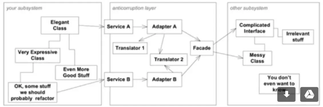 实施战略设计时候,有一个重要的实践是限界上下文的识别,当存在多个限界上下文的时候,很有可能需要集成,防腐层是常见的集成手段。 来看这个示意:Service A 是左侧限界上下文暴露出来的接口,通过适配器调用右侧限界上下文的接口。