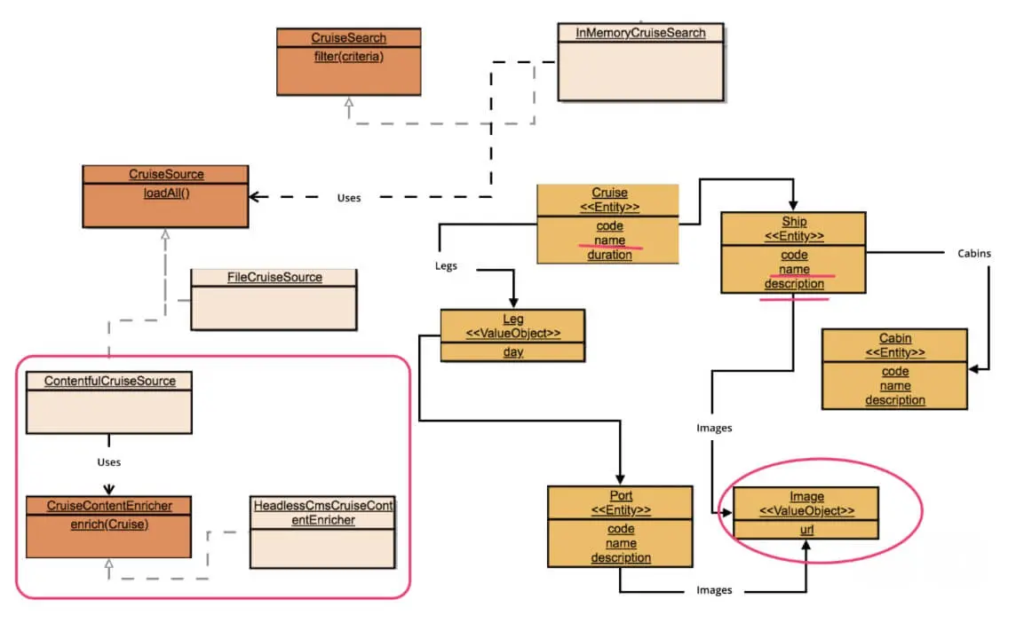 一种方案是将这些描述信息加入到领域模型中,由于已有的两个数据源都无法提供这些信息,我们又引入了ContentfulCruiseSource及另一个出口端口CruiseContentEnricher及其Driven Adapter以便填充这些信息。但这个方案不够理想: