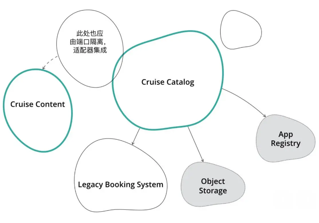 在限界上下文概念指导下的另一种方案,引入CruiseContentEnricher既作为入口端口、同时也作为出口端口,保持邮轮搜索上下文不被干扰,这个方案的好处是,假设邮轮搜索引擎进行微服务改造,很有可能将描述信息填充的职责分离到单独的服务中去,这时,只需要再提供一个输入、输出不含描述信息的Driving Adapter就可以了。