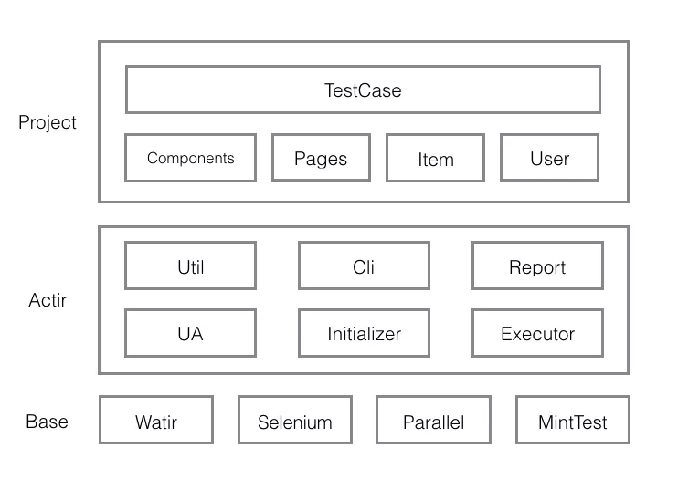 Base:这一层和大多数 UI 测试框架大同小异,使用的是 selenium 和 watir,用例管理方面并没有使用 Ruby 领域炙手可热的 BDD 框架 cucumber,而是最基本的单元测试框架 MiniTest。同时还引入了 ruby 的多线程包,配合 UI 脚本的并发执行。