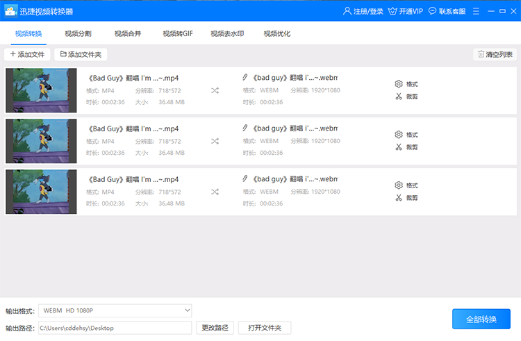 4、最后就可以点击全部转换按钮,然后等待软件将mp4视频转换成webm视频格式了。