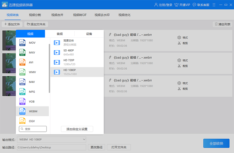 3、然后选择软件下面的输出格式中的webm视频格式输出,webm视频的分辨率可以选择HD 1080P或者其他的分辨率参数,