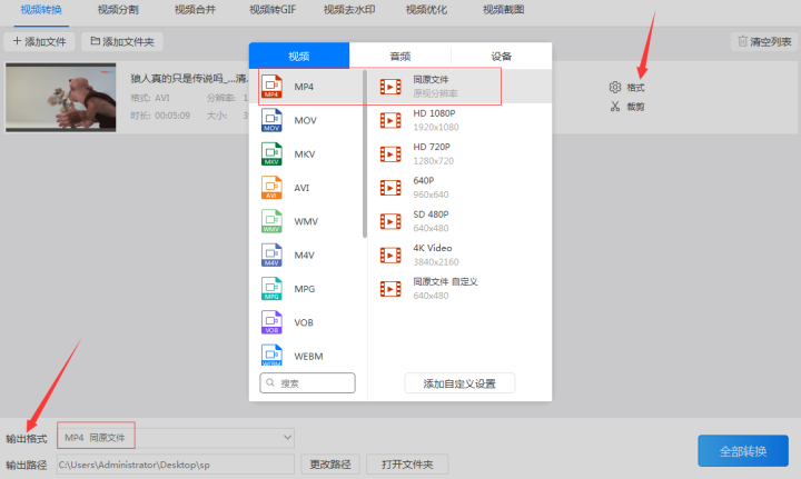2、添加好avi格式的视频后点击“格式”或“输出格式”按钮设置视频转换的格式。而输出格式又分为输出的视频格式和输出的视频分辨率。因为要把avi格式转换成mp4所以把输出的视频格式设置为‘mp4’格式,视频的分辨率则可以设置为和原视频相同分辨率的‘同原文件’格式。