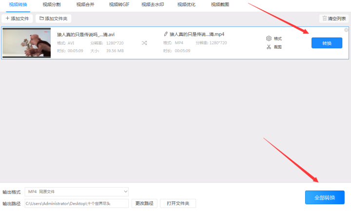 4、设置好“输出路径”后点击“转换”或“全部转换”按钮把avi格式转换成mp4。在视频转换时软件会出现一个进度条,当进度条到达100%就表示软件视频格式已经转换好了。最后只需点击覆盖在“转换”按钮上的“打开”按钮就可以到达输出路径然后打开转换后的mp4视频格式了。